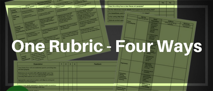 Keeping in mind that the rubric is designed to be a teaching tool—not just an evaluation—I’ve redesigned this rubric into three additional versions, each of which may be easier for teachers to implement and for students to understand. Any rubric can be adapted to any of these forms—and they really don’t take much time to create, once the original rubric has been developed.